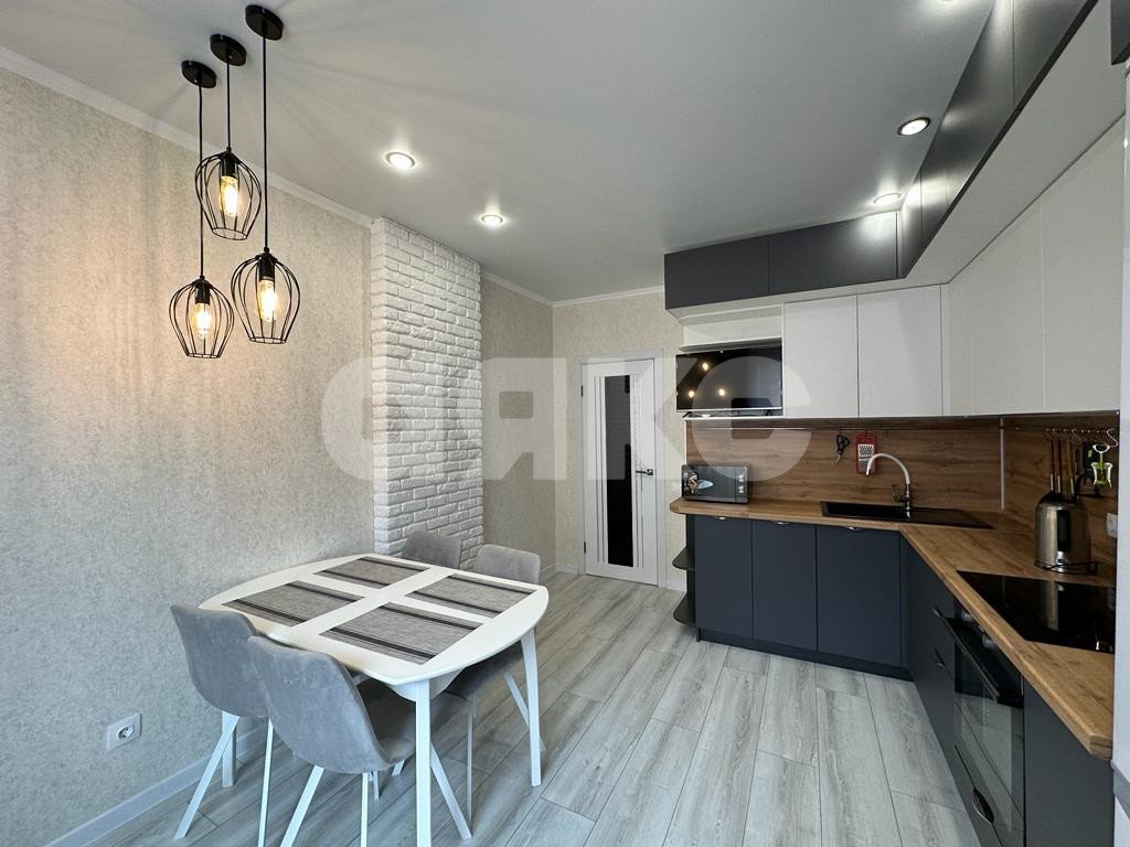 На кухне вместительный гарнитур с встроенной техникой: варочная поверхность, духовой шкаф с вытяжкой, посудомоечная машина и холодильник. Также есть два телевизора, микроволновая печь и стиральная машина.