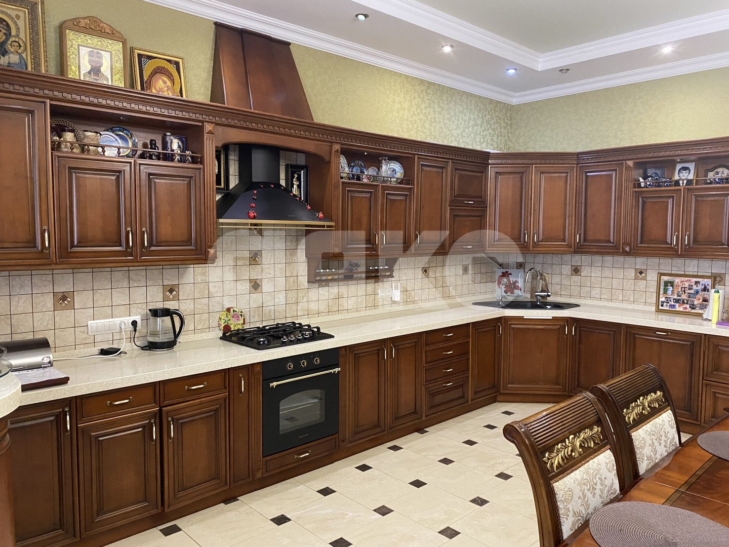 Центральным элементом гостинной является камин, напротив которого удобно расположились мягкий диван и кресла, создавая идеальное место для семейных вечеров и дружеских встреч. Кухонная мебель выполнена из массива красного дерева и оборудована современной техникой, позволяя готовить настоящие кулинарные шедевры.